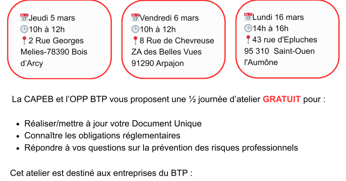 Session Document Unique 78 La CAPEB et l’OPP BTP vous proposent une 1/2 journée d’atelier GRATUIT pour : Réaliser/mettre à jour votre Document Unique Connaître les obligations réglementaires Répondre à vos questions sur la prévention des risques professionnels 5 mars 2026 Bois d'Arcy