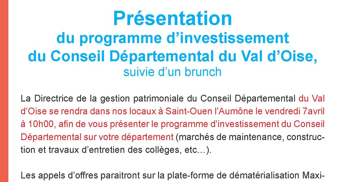 La Directrice de la gestion patrimoniale du Conseil Départemental du Val d’Oise se rendra dans nos locaux à Saint-Ouen l’Aumône le vendredi 7avril à 10h00, afin de vous présenter le programme d’investissement du Conseil Départemental sur votre département (marchés de maintenance, construction et travaux d’entretien des collèges, etc…).